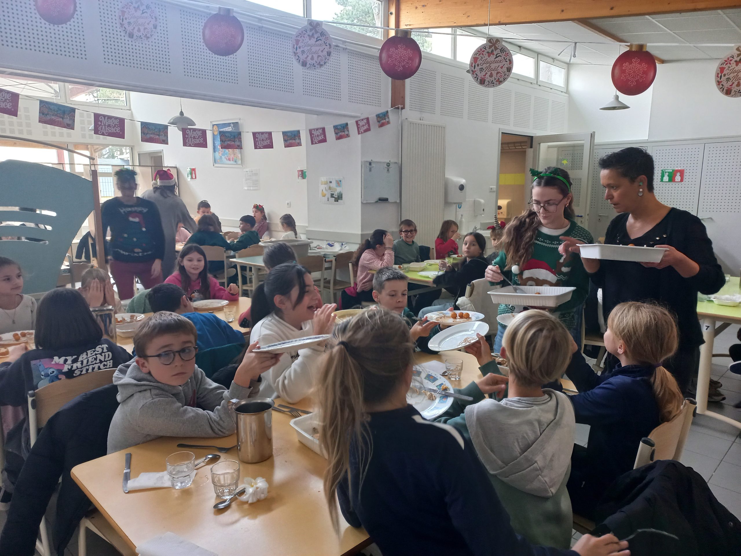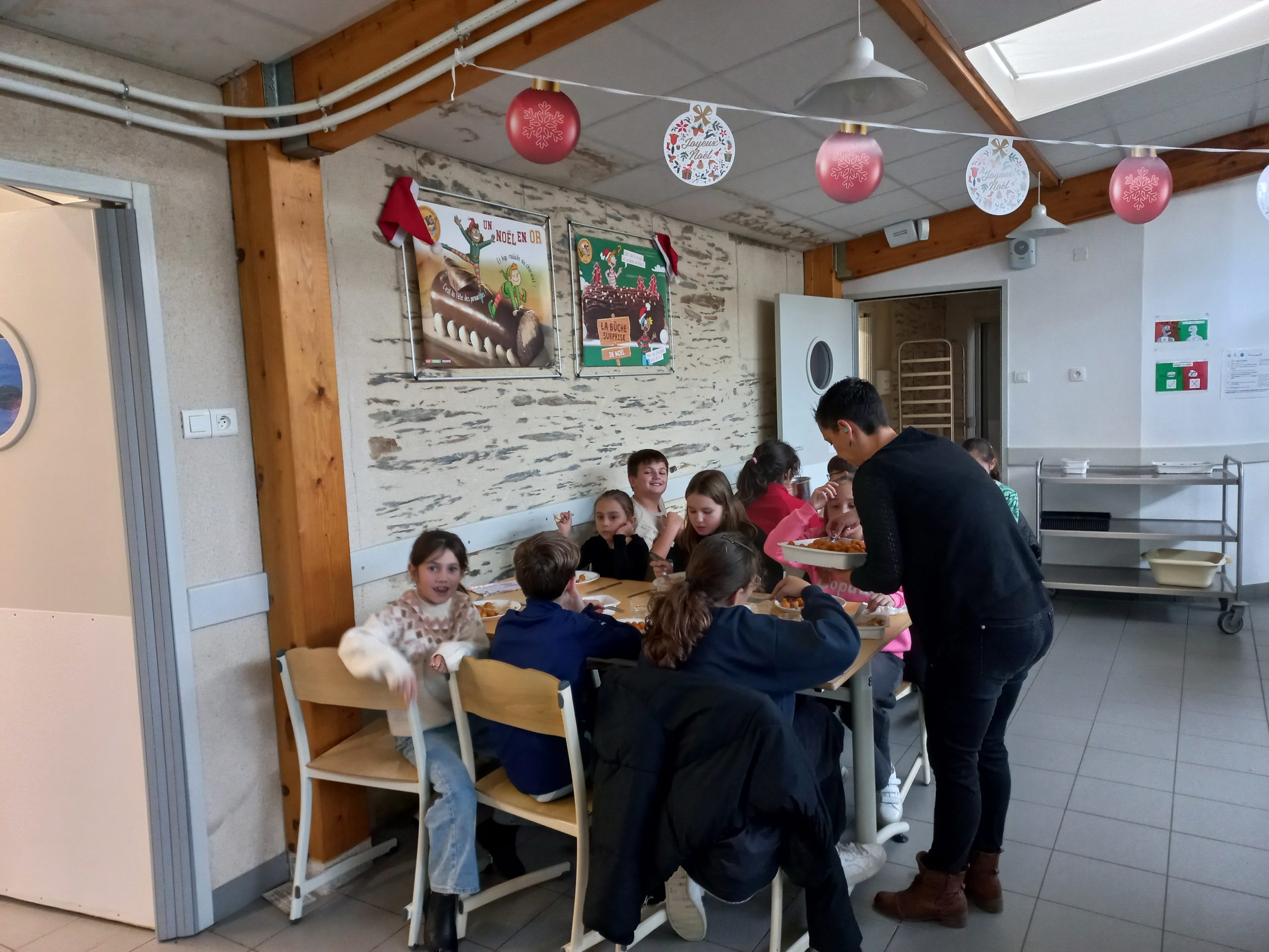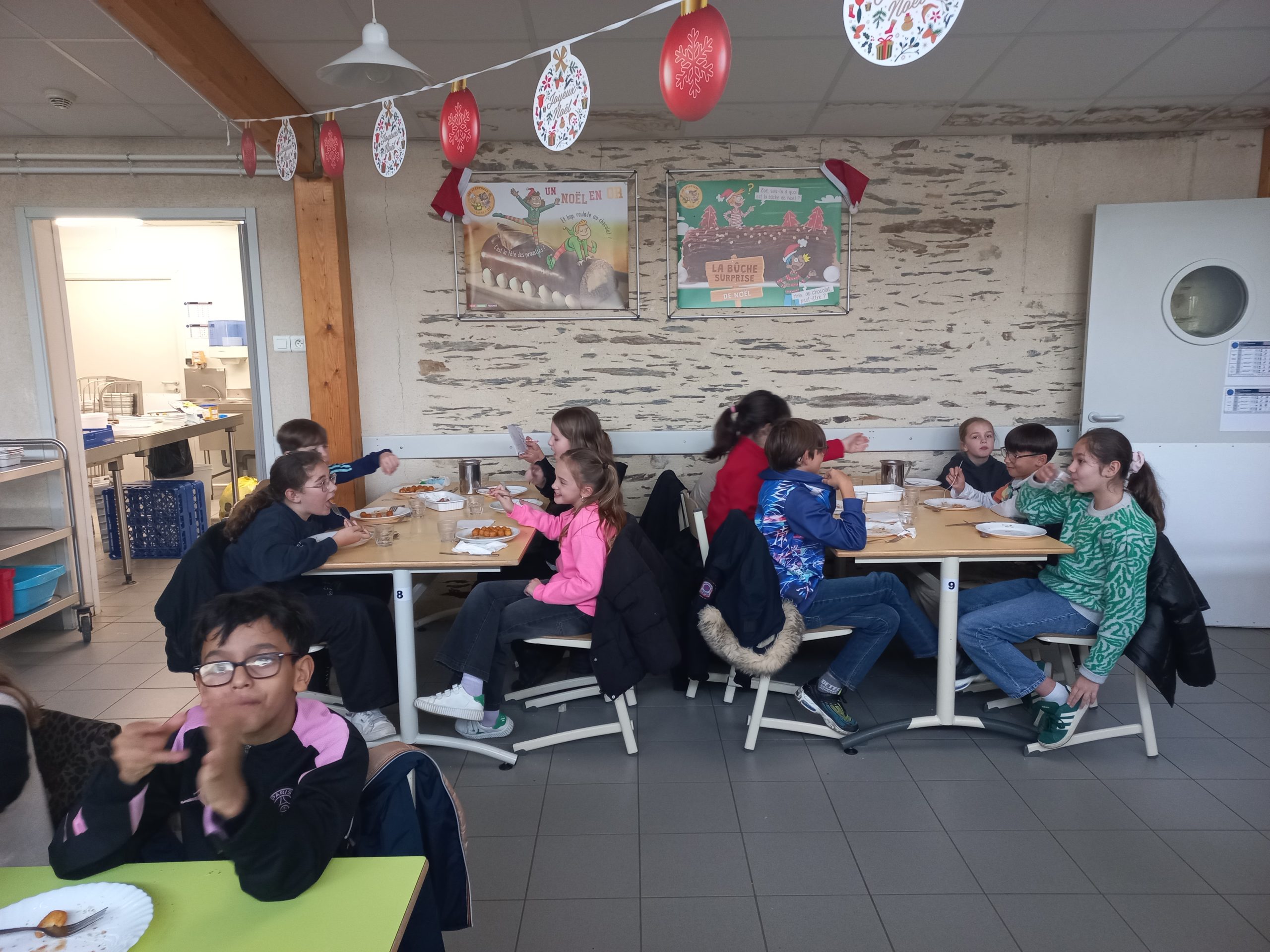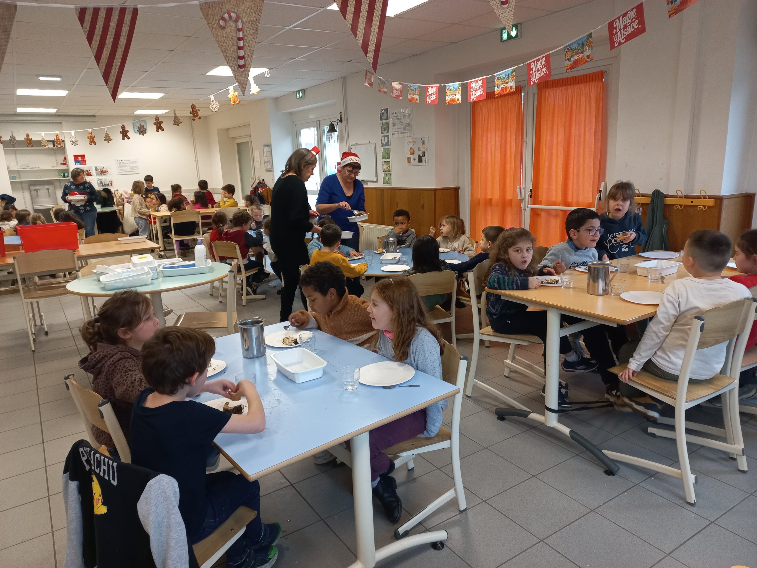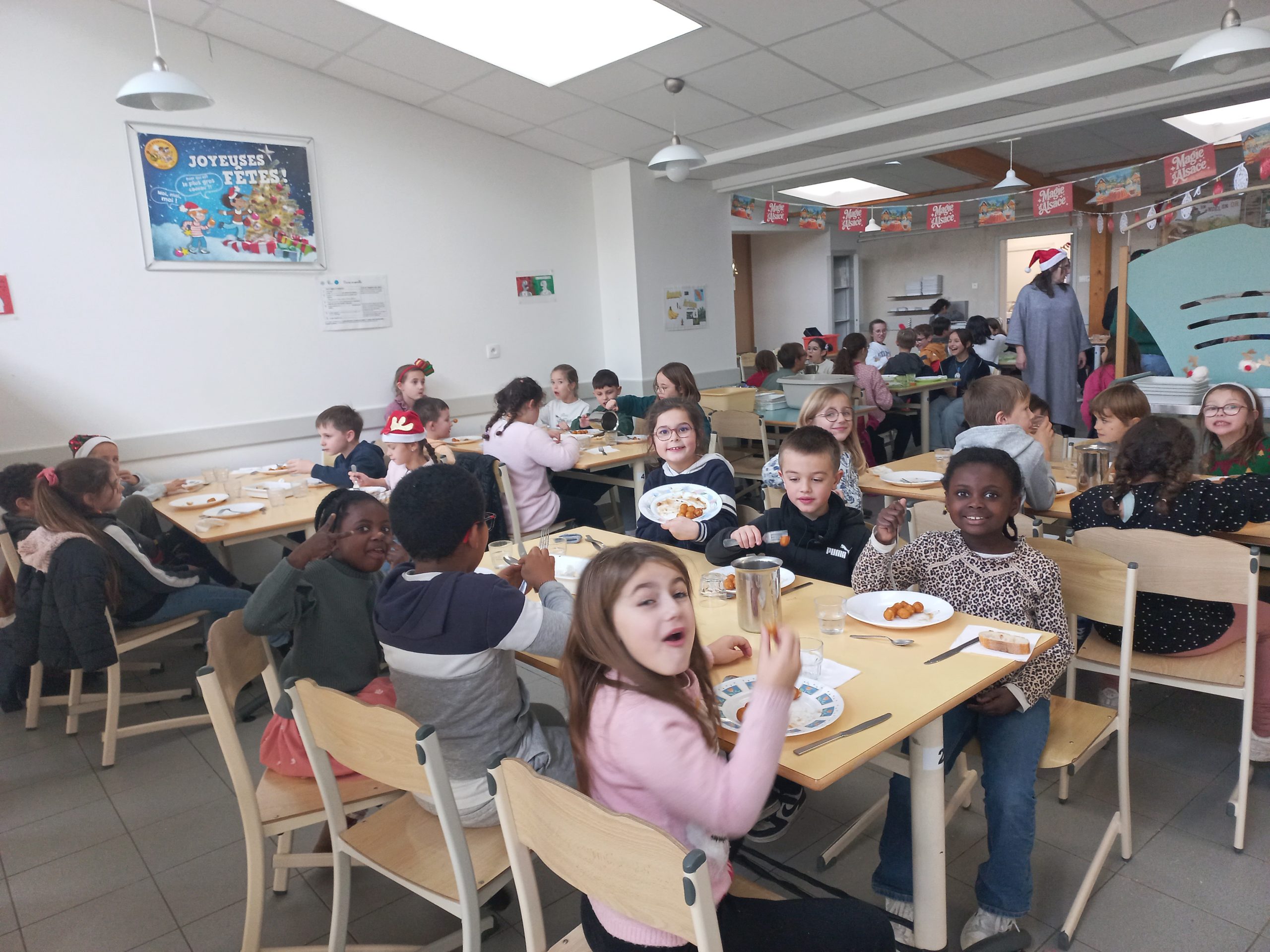 Repas de Noël par Marina Dubourg · 19 décembre 2025 Le jeudi 18 décembre, 240 enfants ont dégusté le repas de Noël : Panier feuilleté aux champignons Aiguillettes de poulet sauce aux marrons Pommes noisettes Tomme blanche Bûche chocolat mandarine Chocolat de Noël