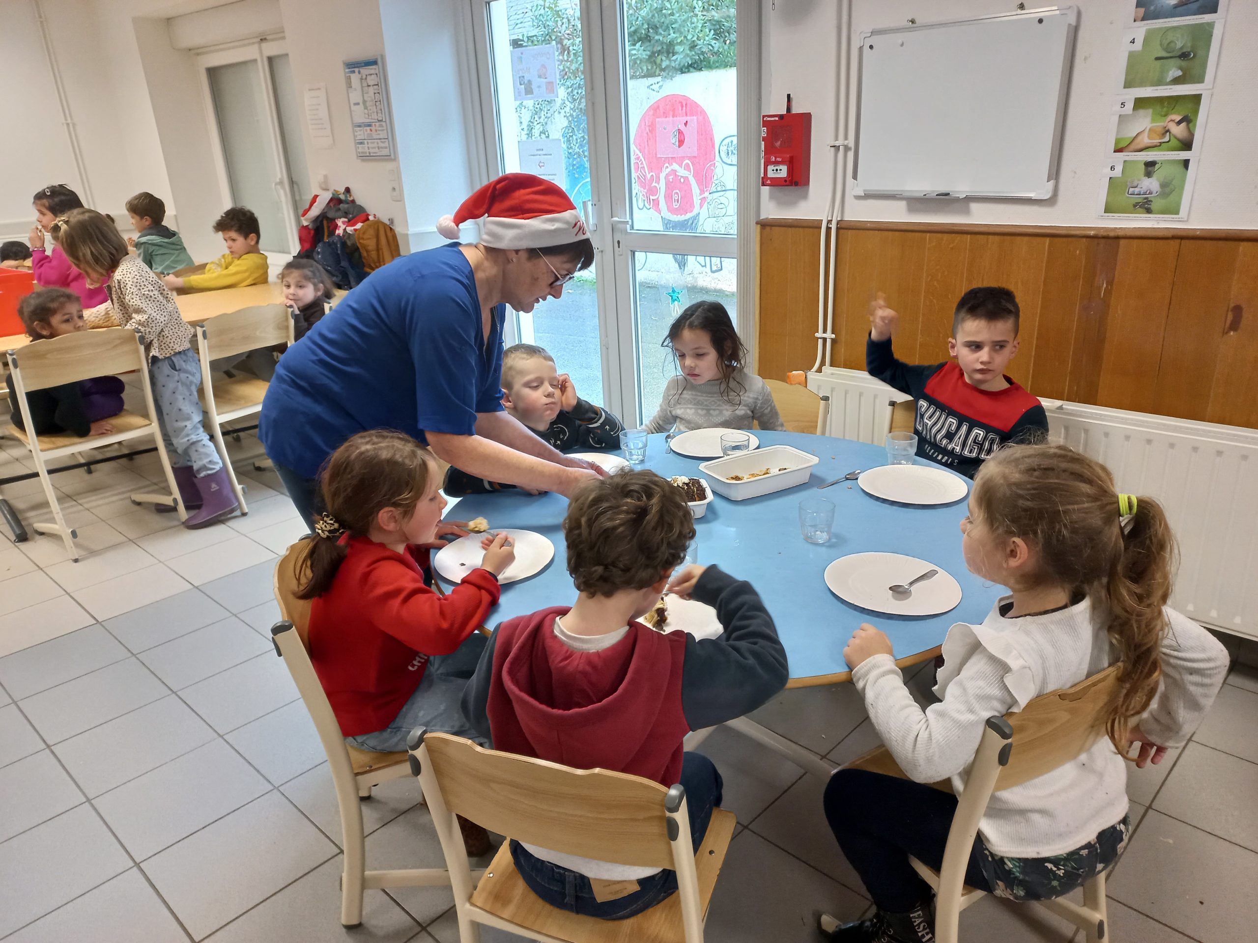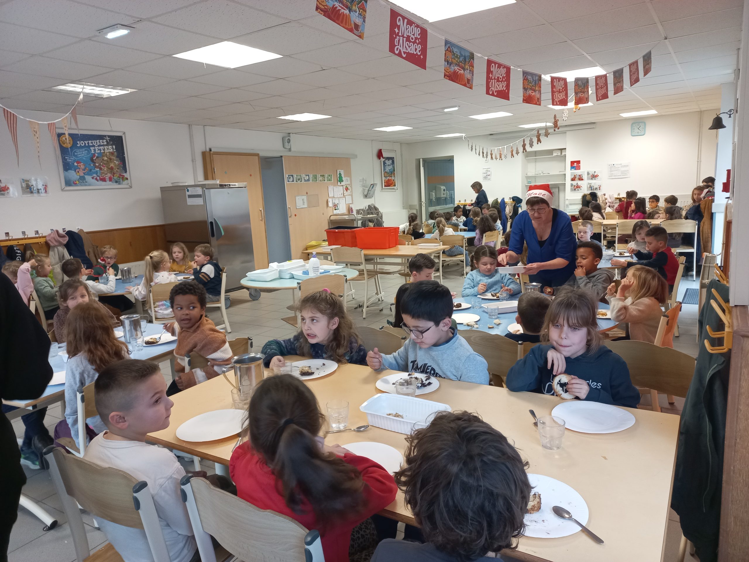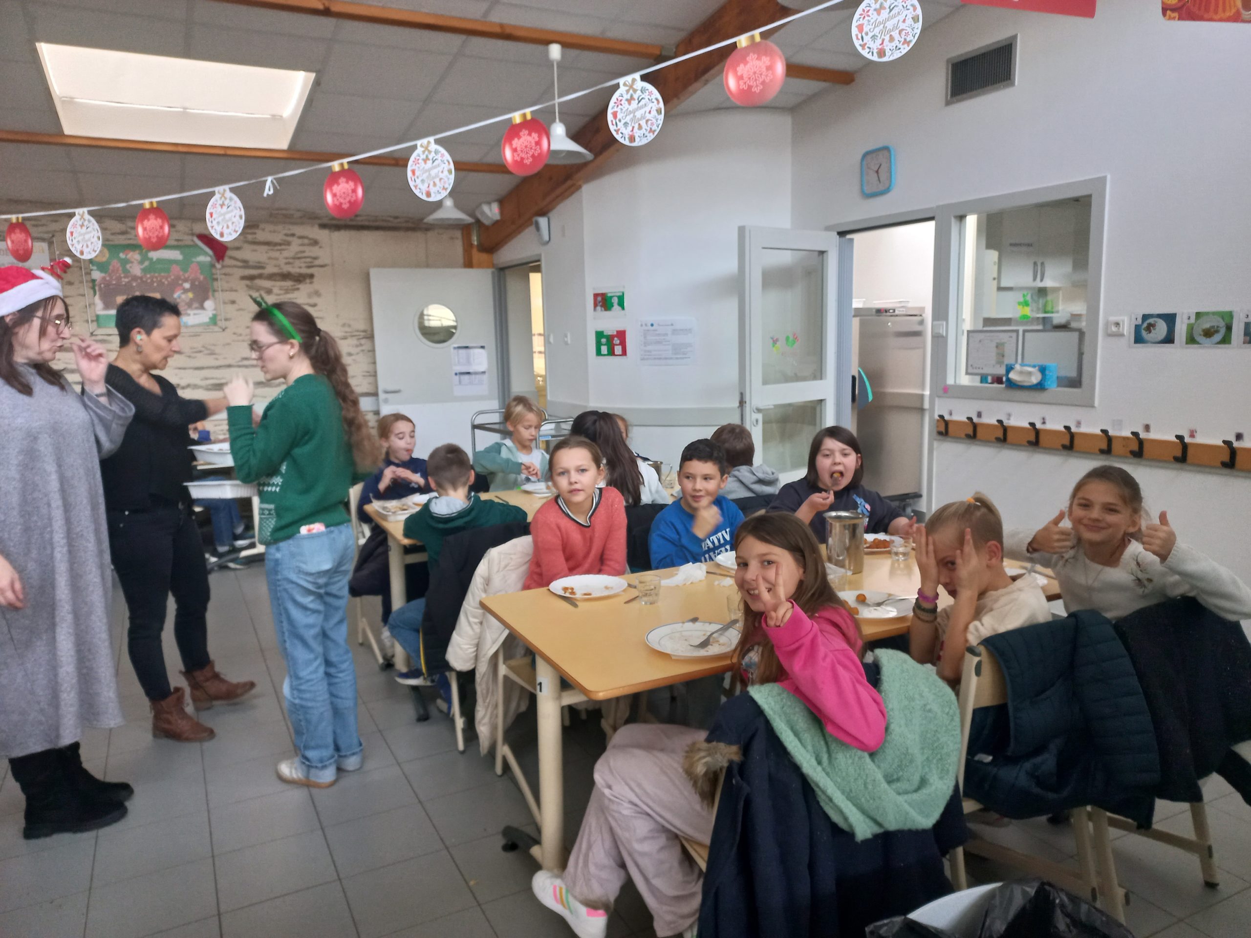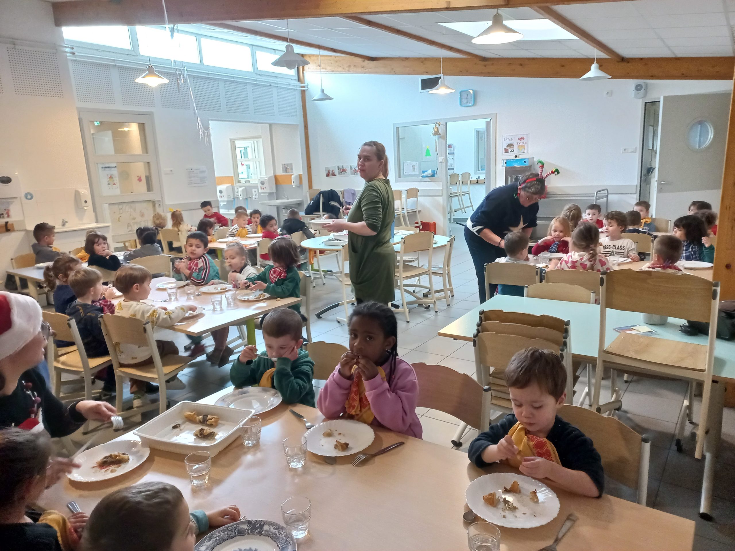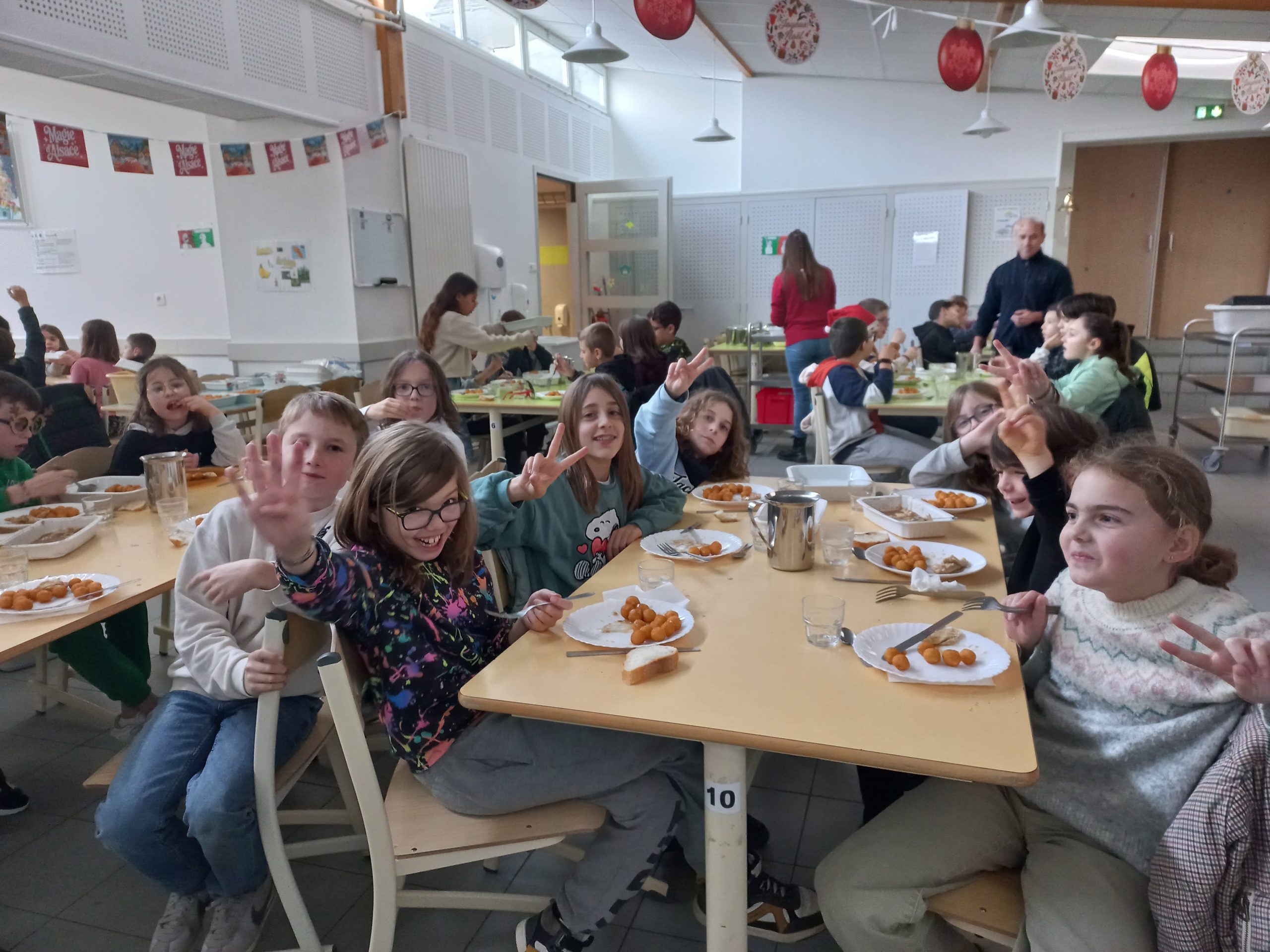Repas de Noël par Marina Dubourg · 19 décembre 2025 Le jeudi 18 décembre, 240 enfants ont dégusté le repas de Noël : Panier feuilleté aux champignons Aiguillettes de poulet sauce aux marrons Pommes noisettes Tomme blanche Bûche chocolat mandarine Chocolat de Noël