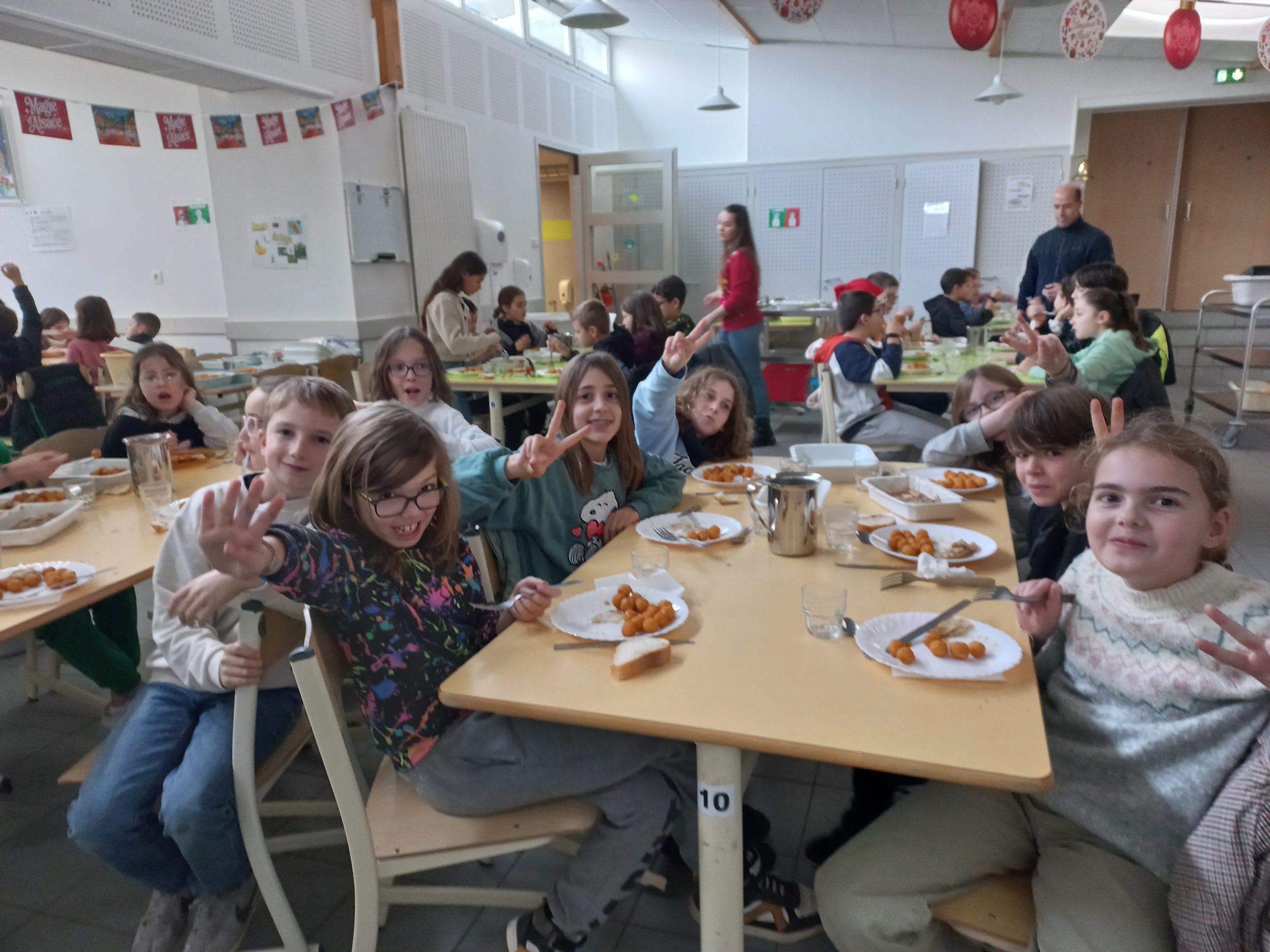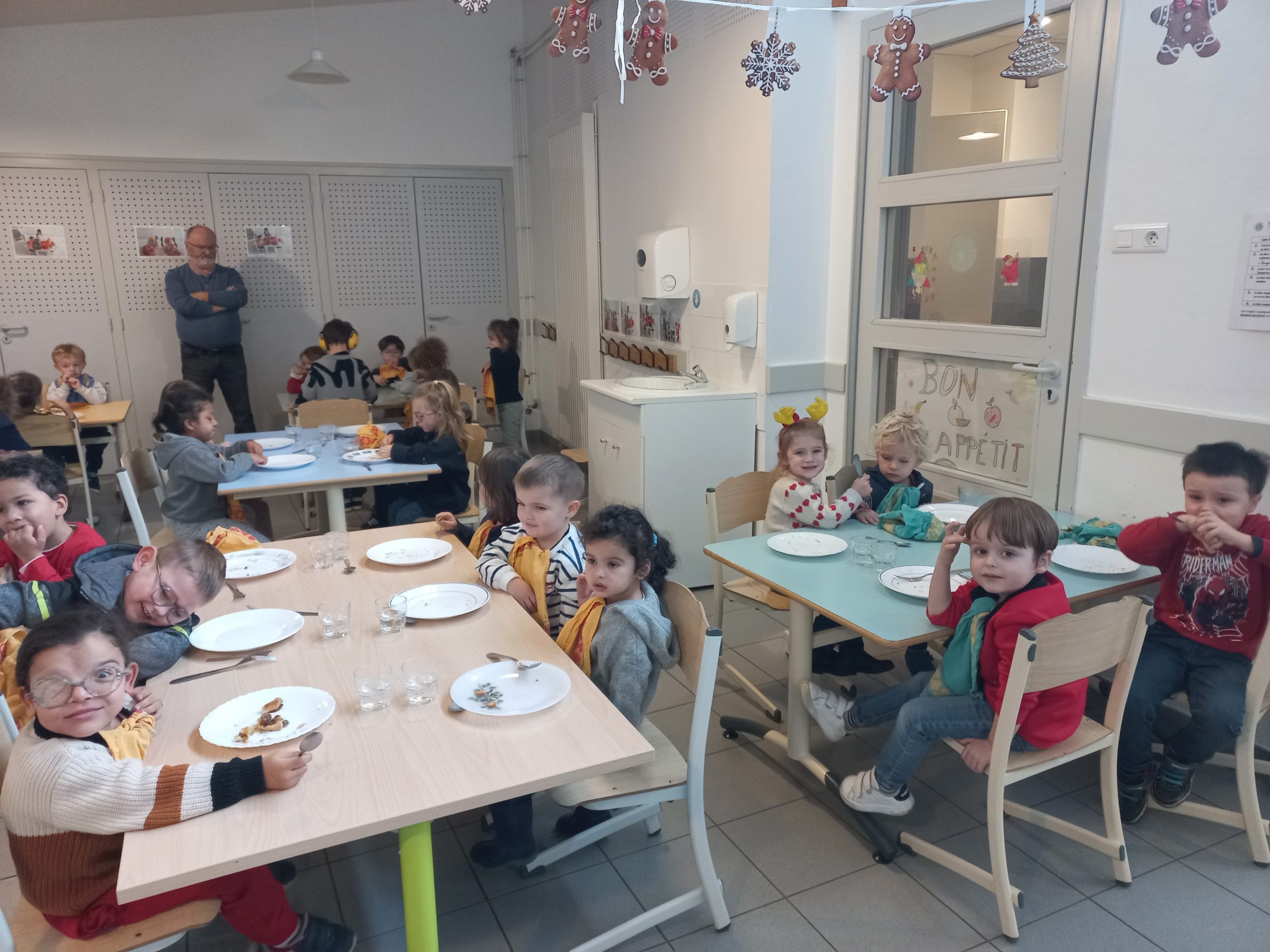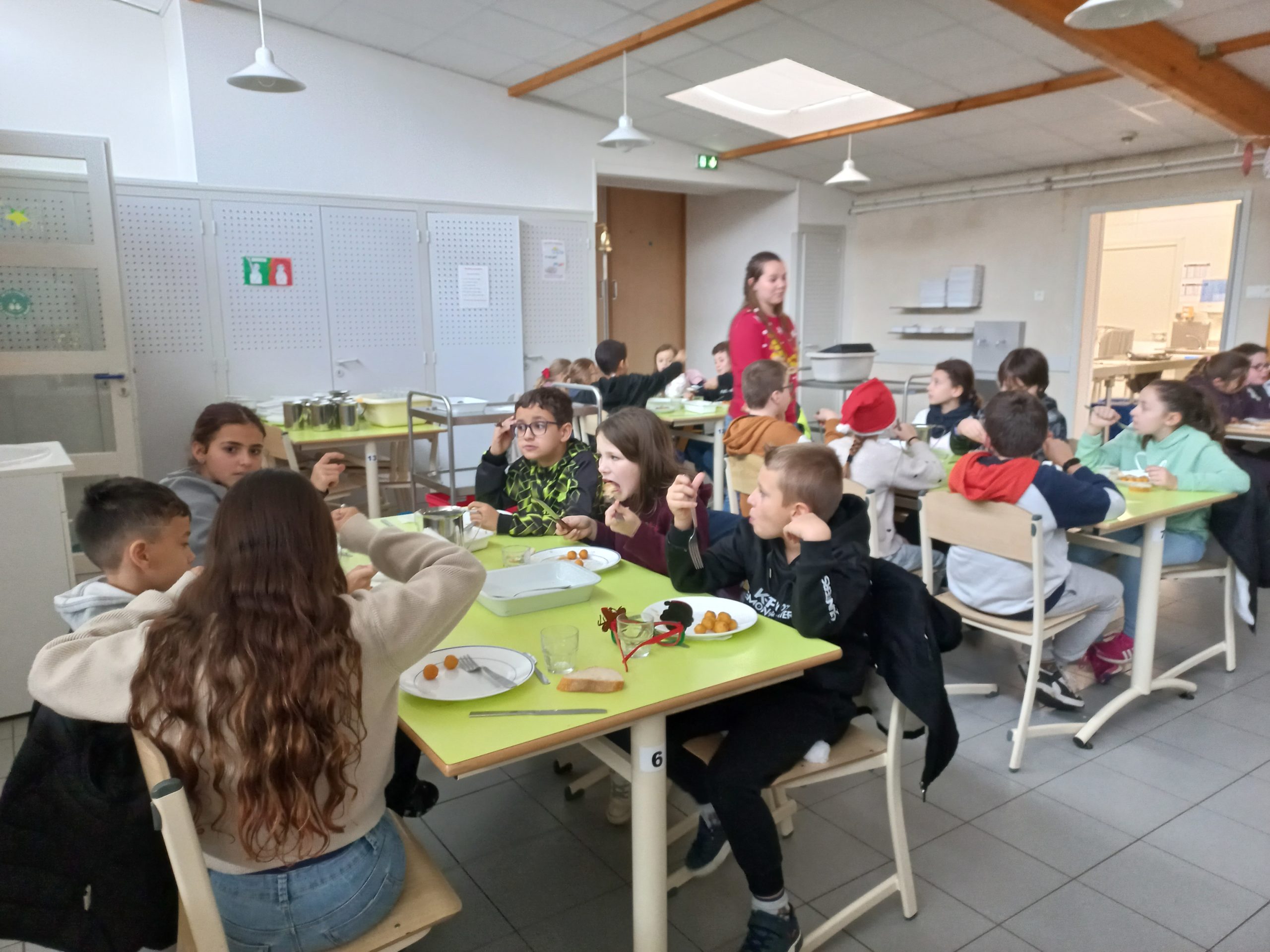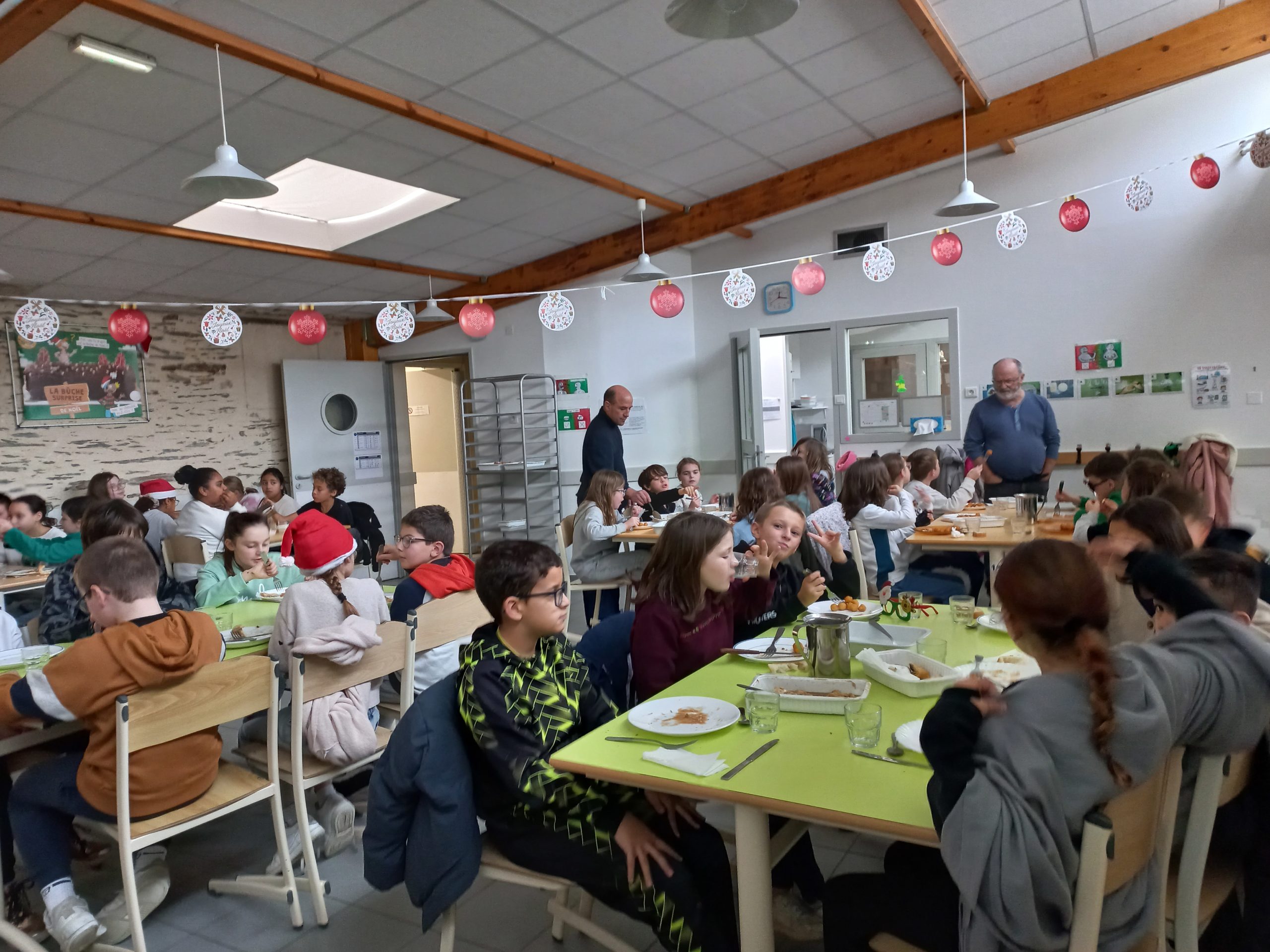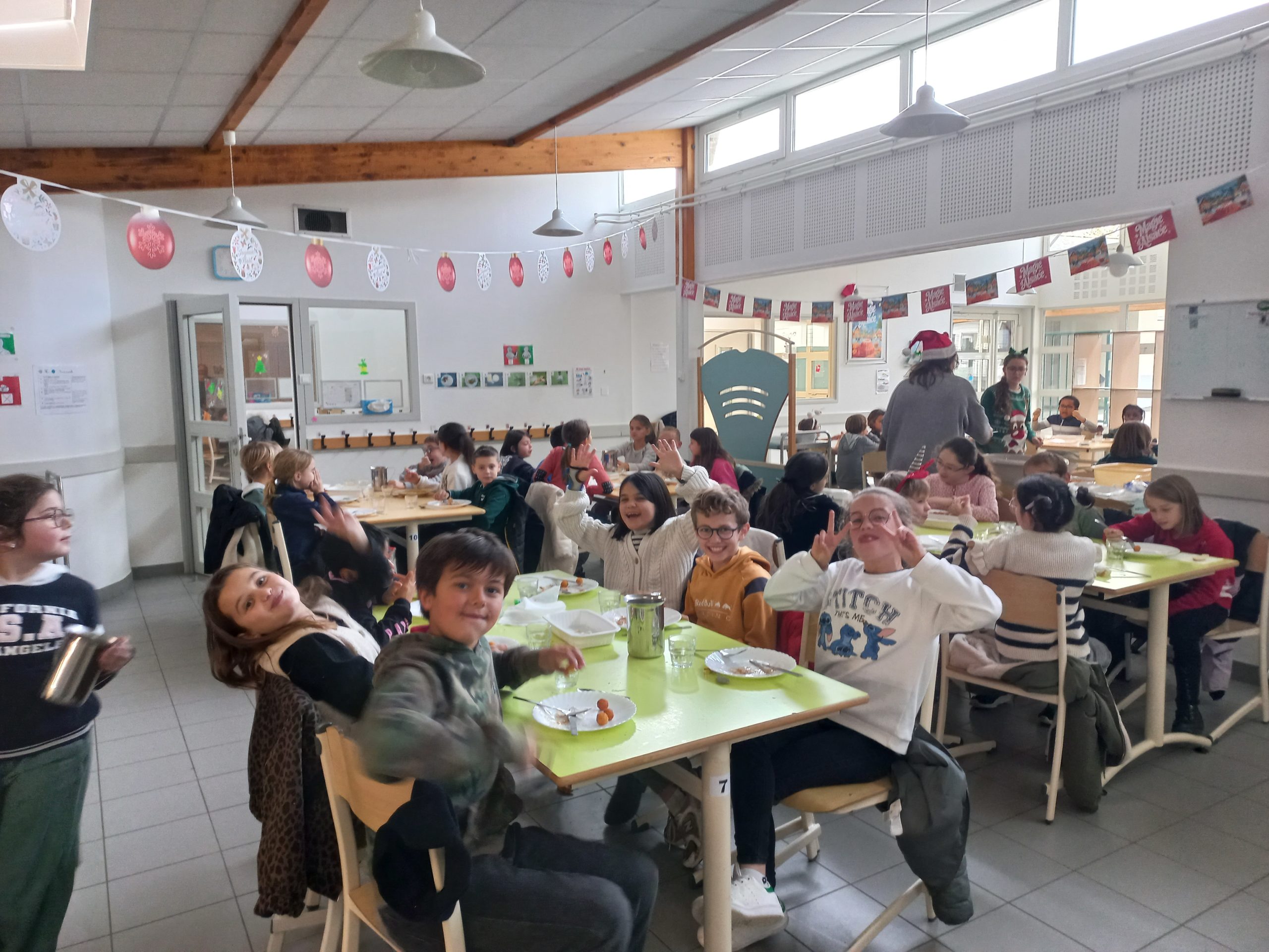 Repas de Noël par Marina Dubourg · 19 décembre 2025 Le jeudi 18 décembre, 240 enfants ont dégusté le repas de Noël : Panier feuilleté aux champignons Aiguillettes de poulet sauce aux marrons Pommes noisettes Tomme blanche Bûche chocolat mandarine Chocolat de Noël