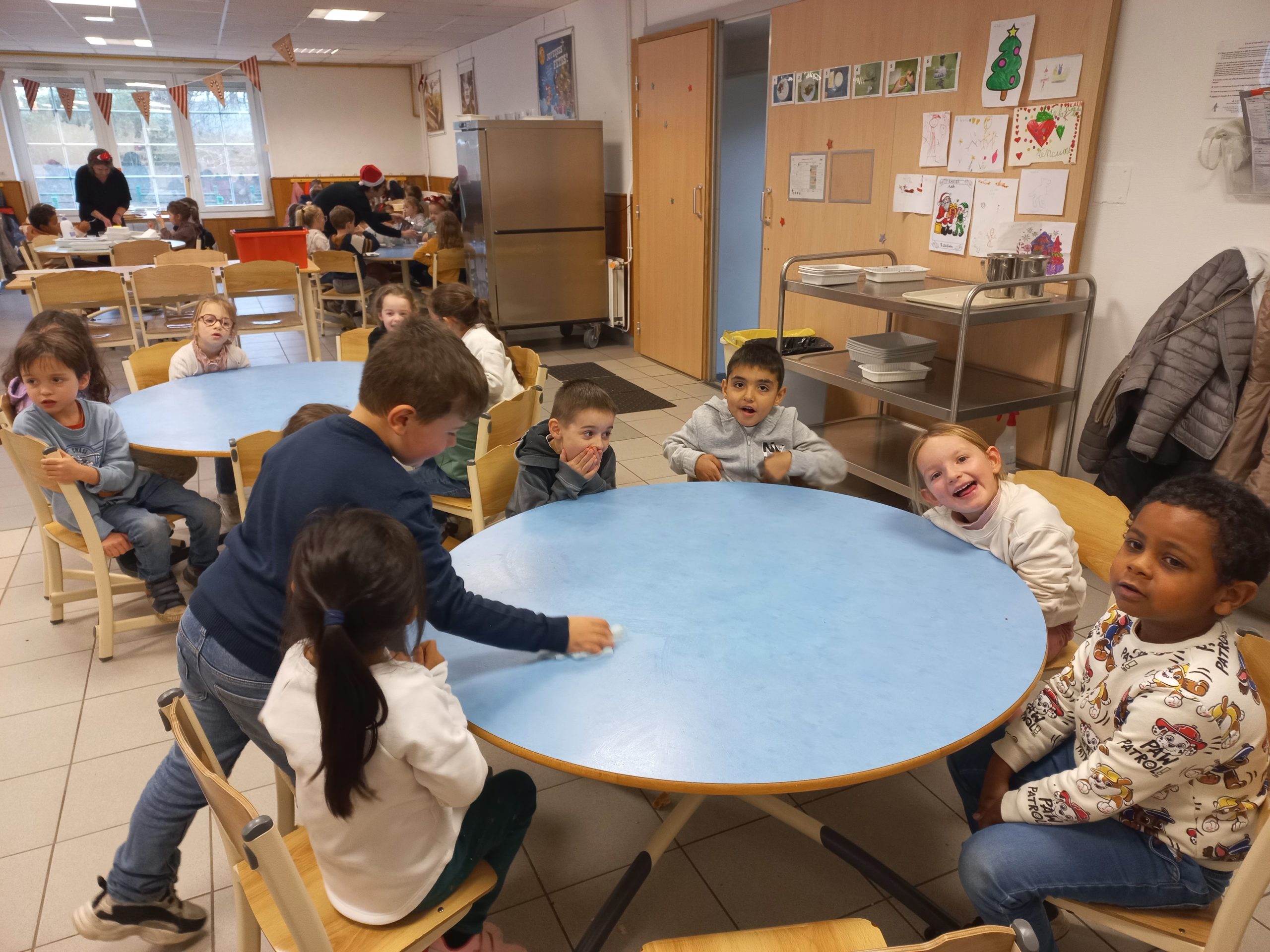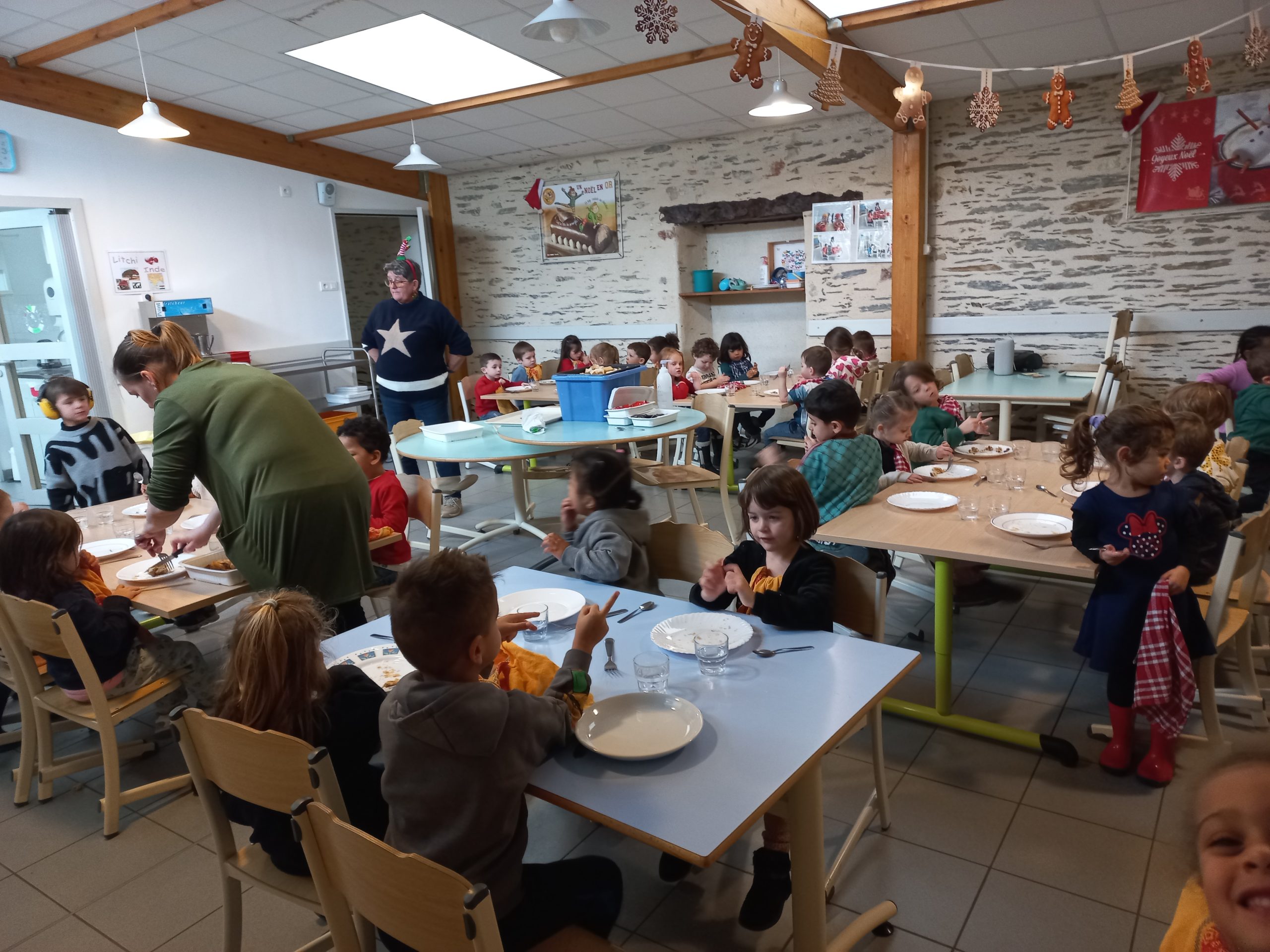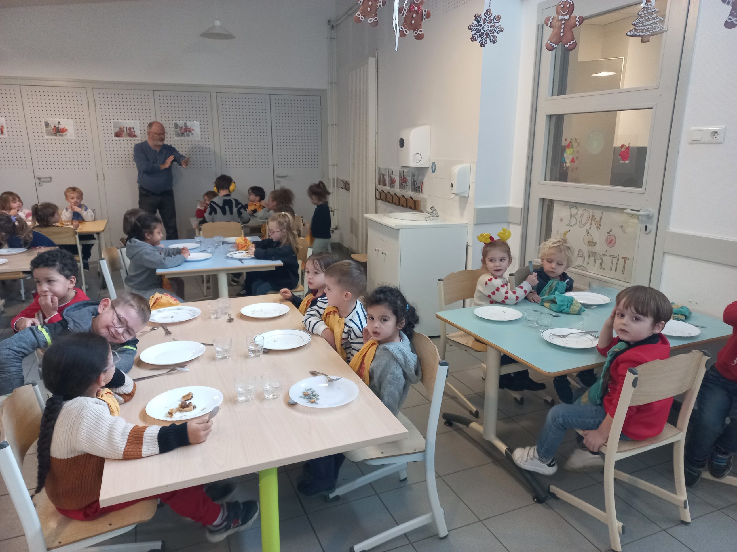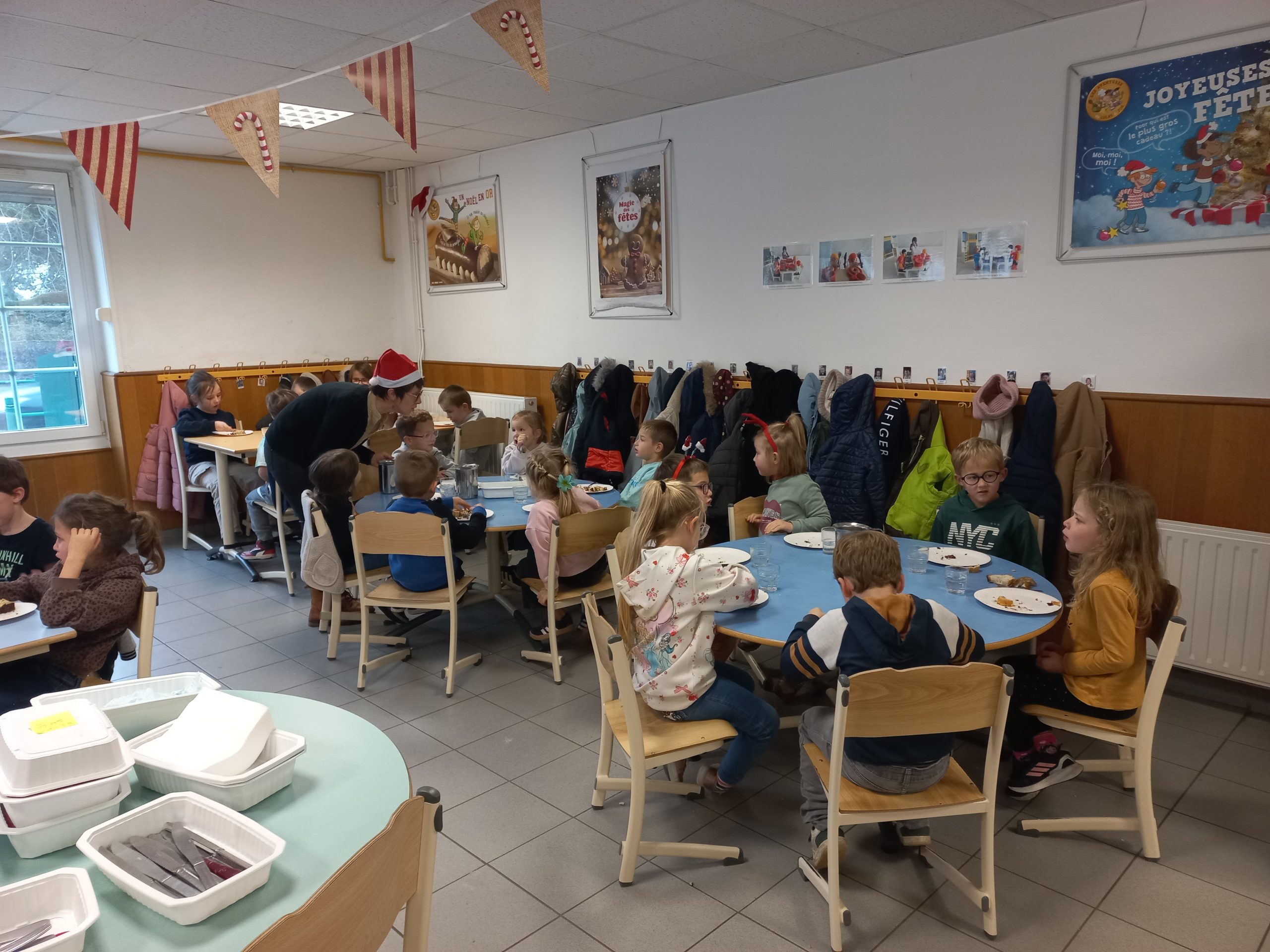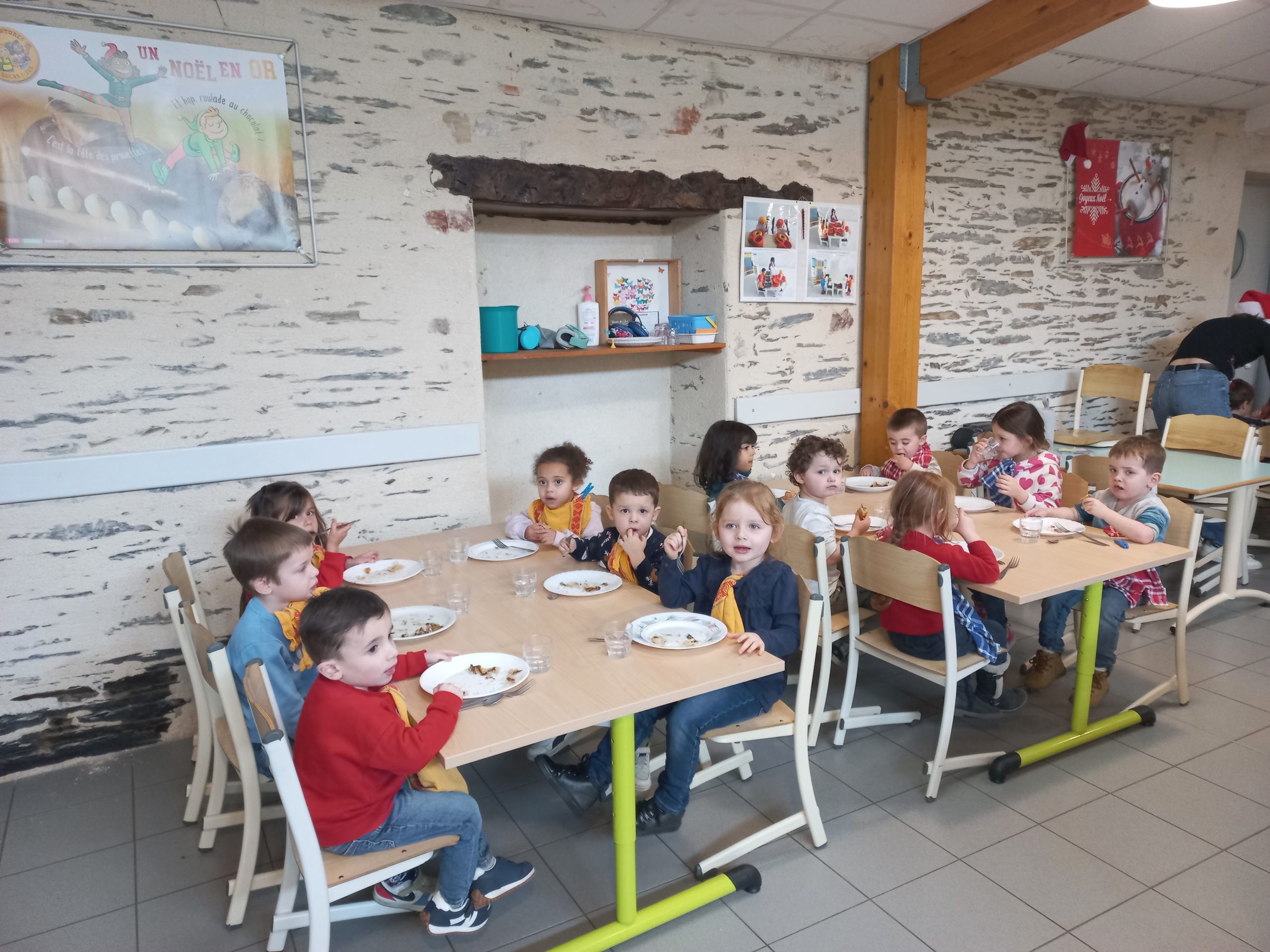 Repas de Noël par Marina Dubourg · 19 décembre 2025 Le jeudi 18 décembre, 240 enfants ont dégusté le repas de Noël : Panier feuilleté aux champignons Aiguillettes de poulet sauce aux marrons Pommes noisettes Tomme blanche Bûche chocolat mandarine Chocolat de Noël