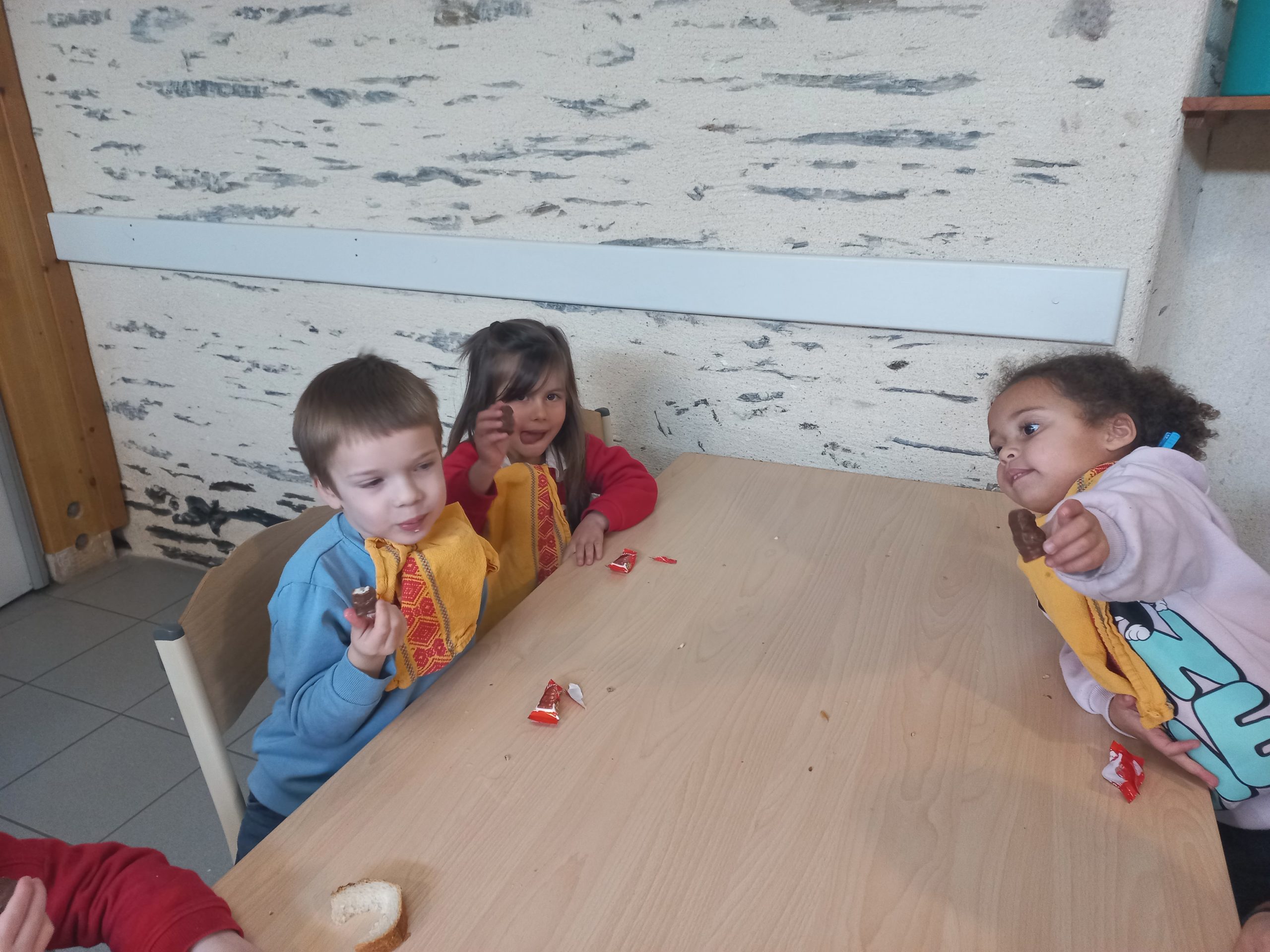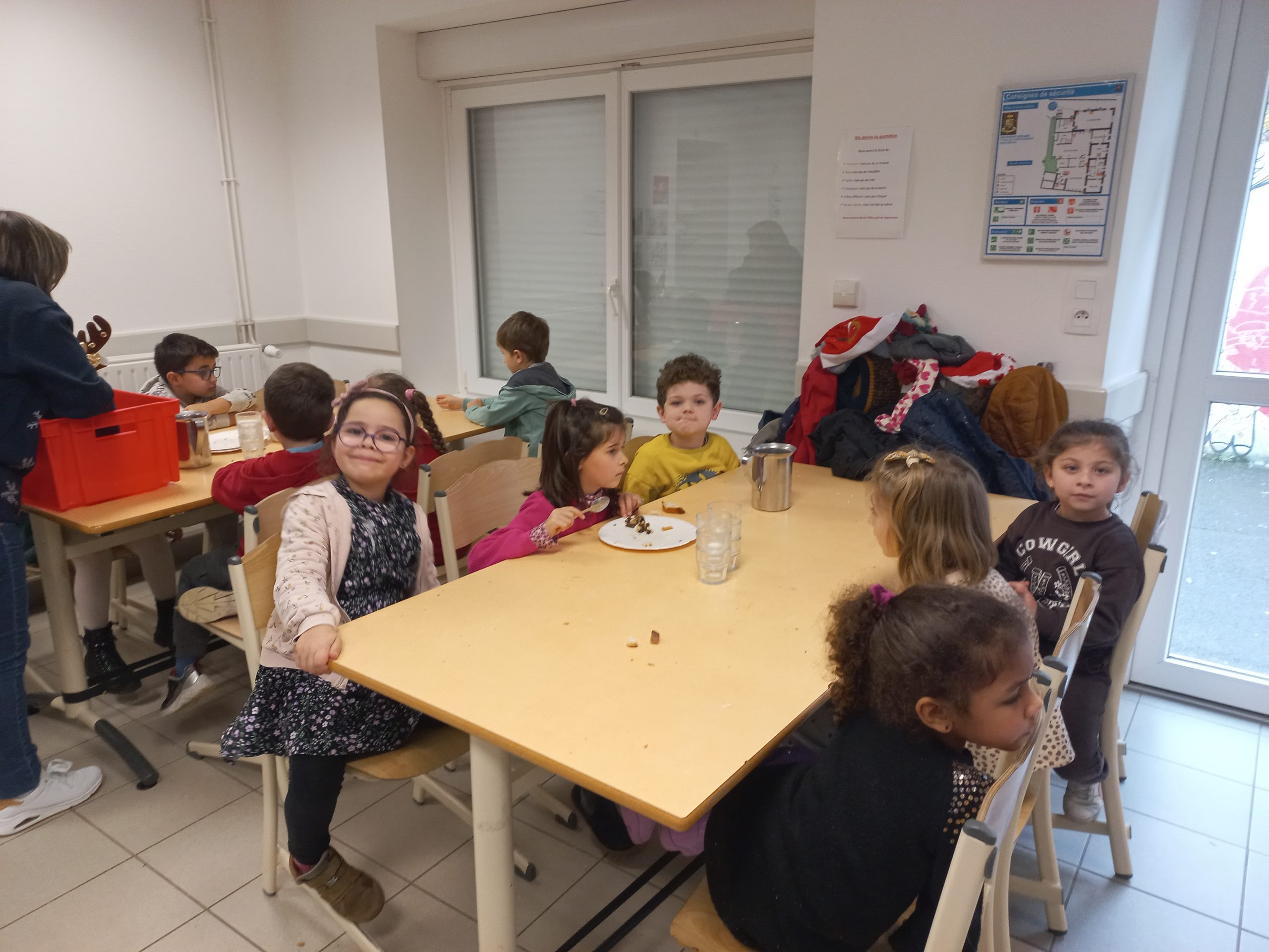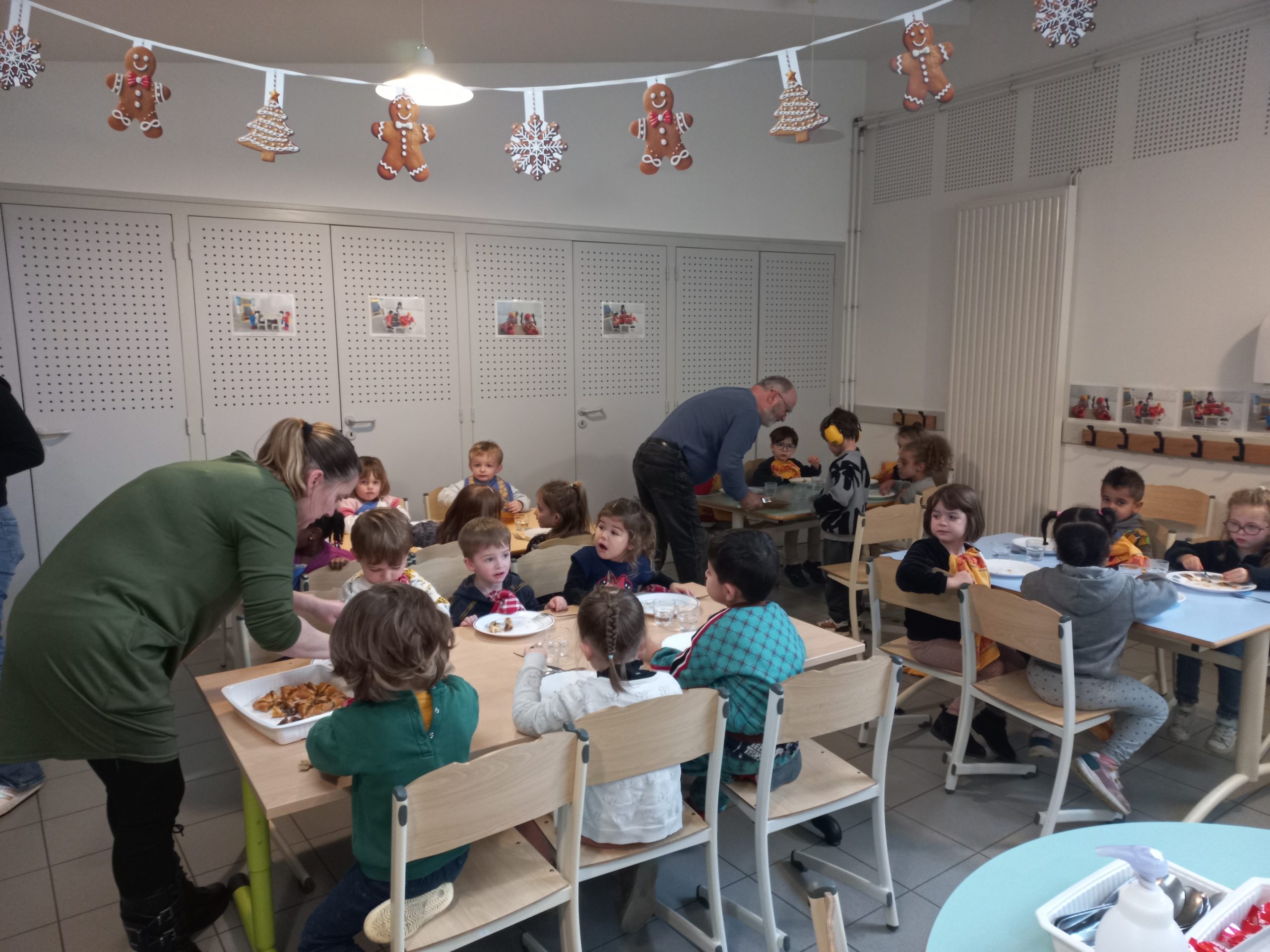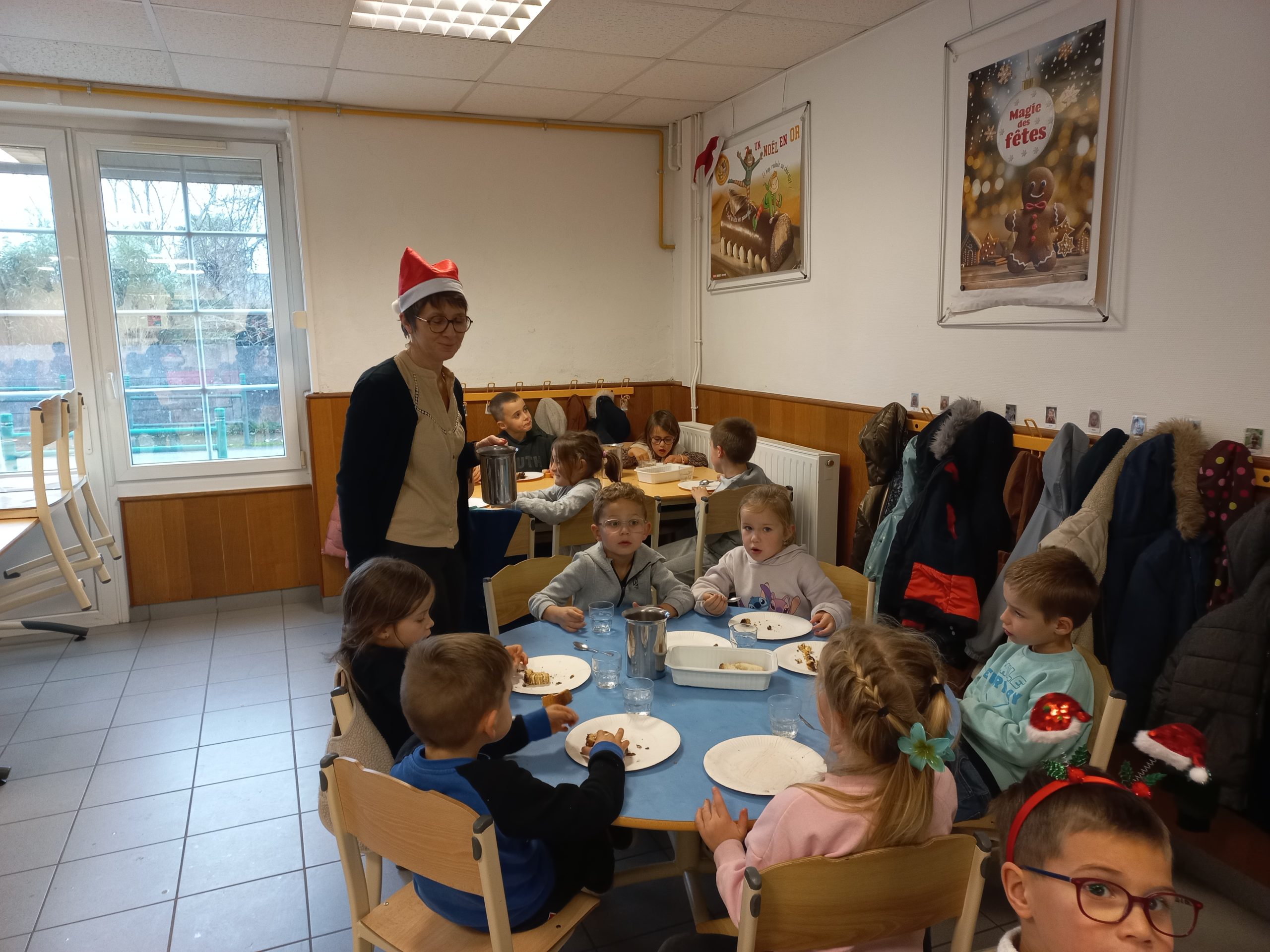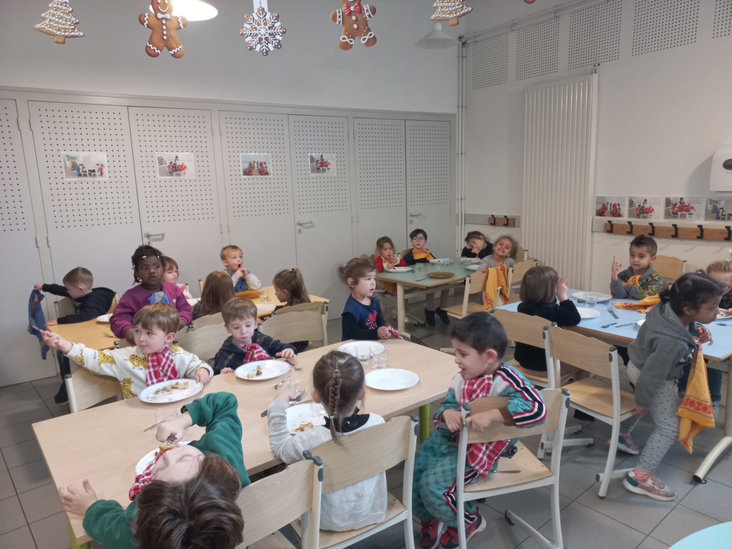 Repas de Noël par Marina Dubourg · 19 décembre 2025 Le jeudi 18 décembre, 240 enfants ont dégusté le repas de Noël : Panier feuilleté aux champignons Aiguillettes de poulet sauce aux marrons Pommes noisettes Tomme blanche Bûche chocolat mandarine Chocolat de Noël